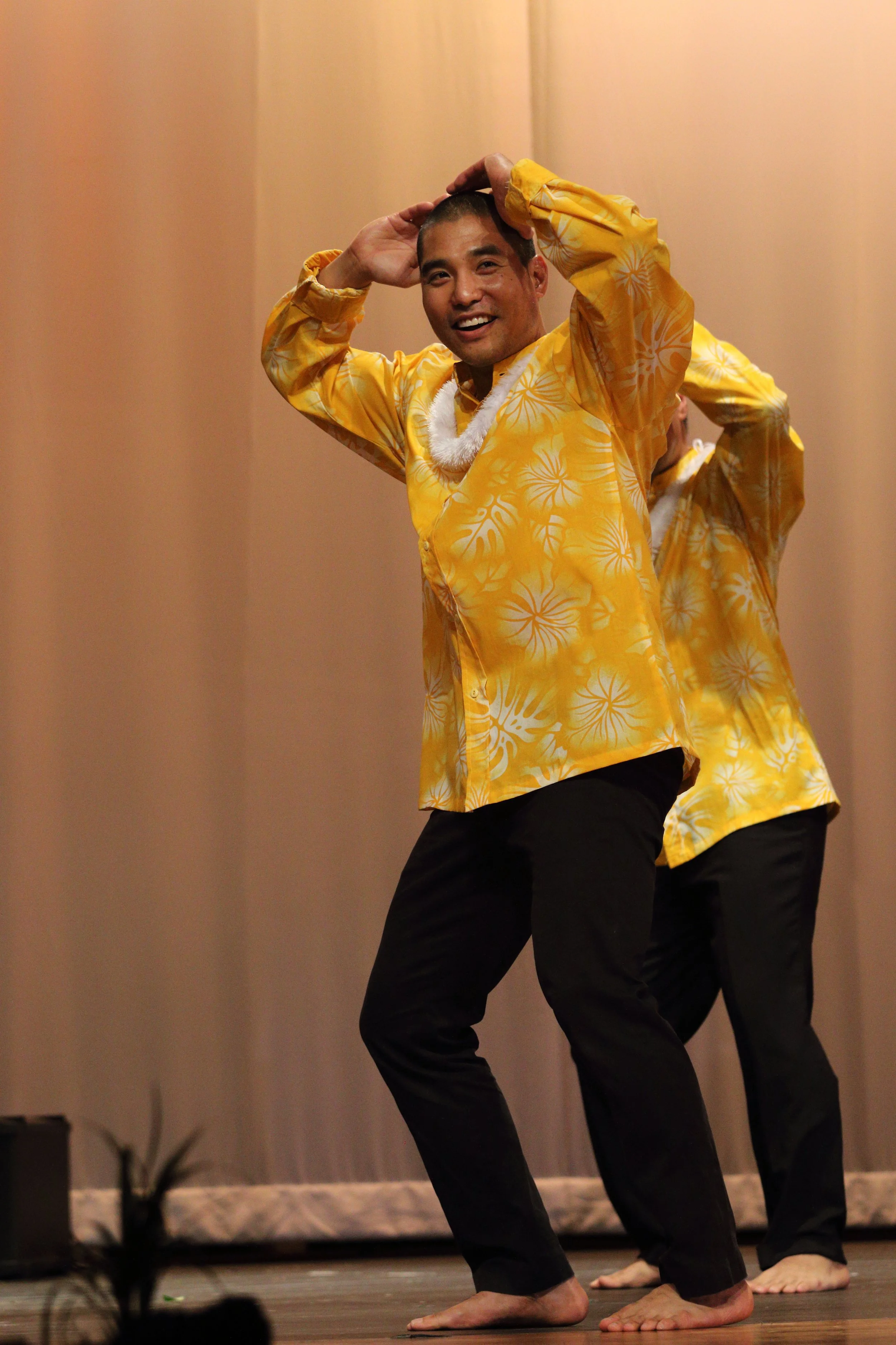 Man in yellow Hawaiian shirt performing a dance on stage with another dancer in the background.