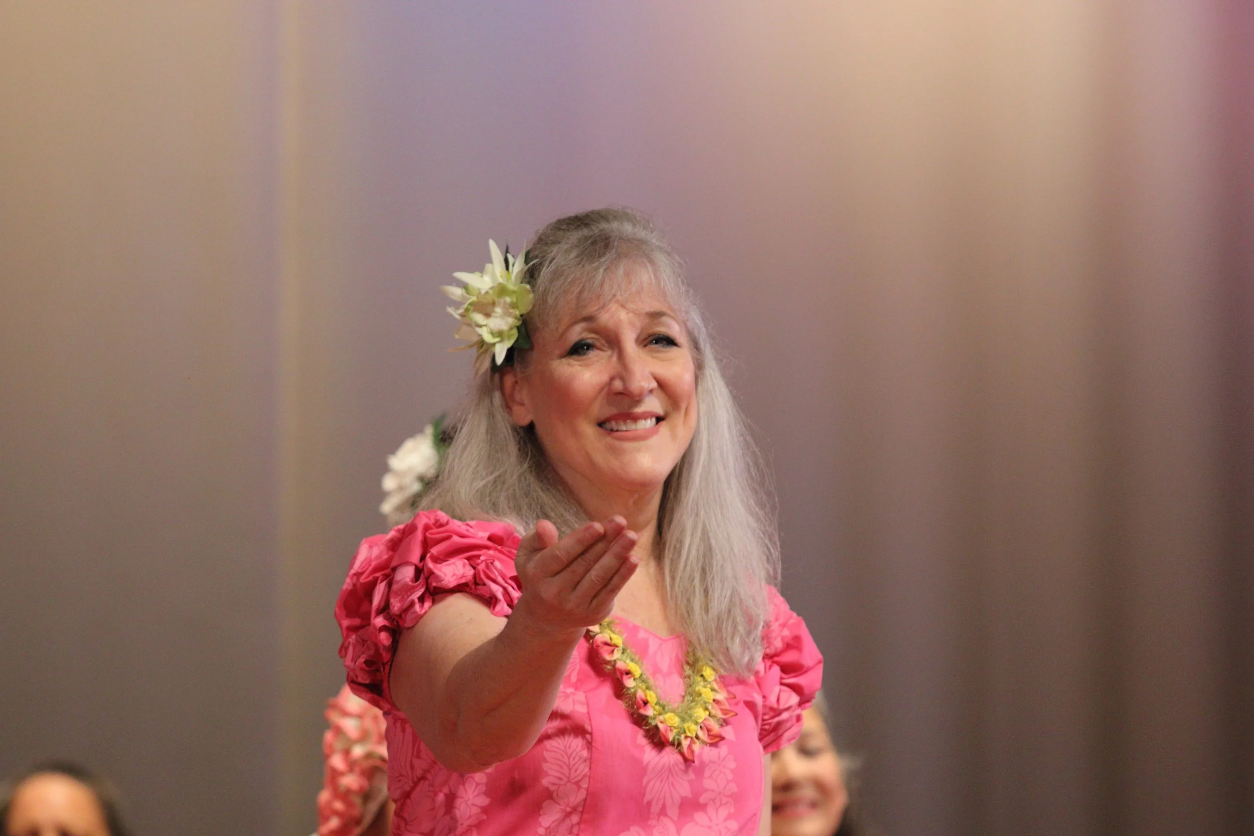 Cecilia Amor is the progeny of a military grandfather and father, who spent many years of his career stationed at various bases in Hawaiʻi. Of Filipino and German descent, Cecilia attended Maryknoll High School and Chaminade University on Oʻahu, and received her master’s degree in public health from the University of Minnesota. She began her hula instruction on the Big Island at the age of nine at a hui whose name she no longer remembers. Upon her arrival in Virginia, Cecilia began to dance with Hui O Ka Pua Ilima, before transferring to Hālau Nohona Hawaiʻi. She has three grown children–one happily canoe paddling in Hawaiʻi—and three grandchildren, and she hopes that at least one of them will share her passion for hula.